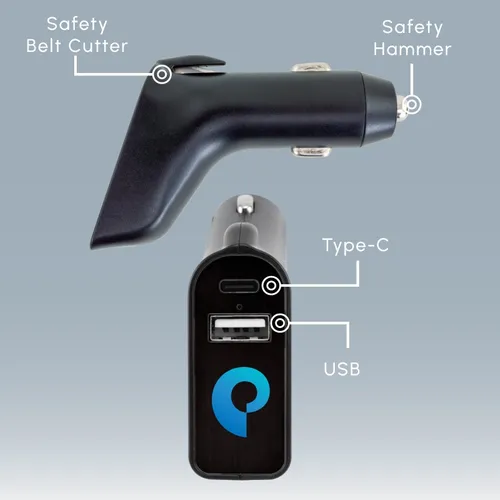 This versatile USB and Type-C port car charger is the perfect companion to charge your devices and serve as an emergency safety tool while on the go. It also includes seat belt cutter and a great addition to any safety kit. Size: 82.5×48×22.5mm DC Input: 12V~24V Output: 5V/3.0A total Each port maximum 5V/2.4A Function: Car charger Safety hammer Safety belt cutter Material: ABS & Aluminum