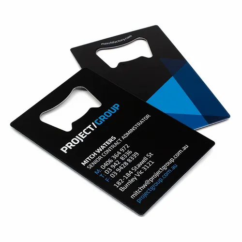 Bottle opener metal business cards made from thick, durable stainless steel. Each card includes a built‑in bottle