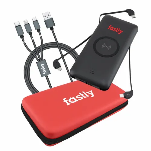 A professional tech kit gift for dynamic business teams that need to be prepared when traveling. Comes with a charging cable, 5000 mAh Power Bank with Wireless Charging, and a large zipper case.