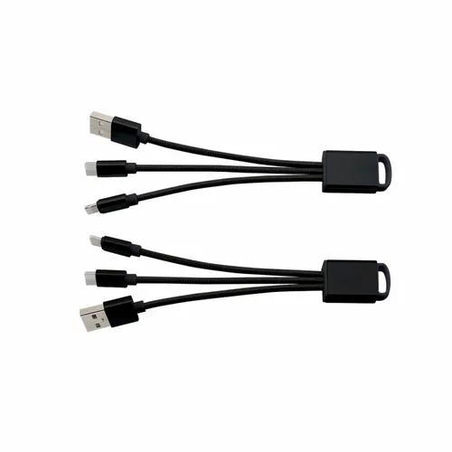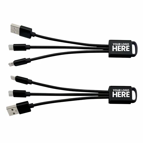 The perfect companion to the stylish tech enthusiast. With the elegant metallic design and durable braided cables this charging cable adds elegance to utility and can be engraved for a subtle refined style or imprinted with color to give your client's logo pop! The cable includes USB, Type-C, Micro-USB/Non-MFi 5-pin Tip combo to cover most Android and other devices.