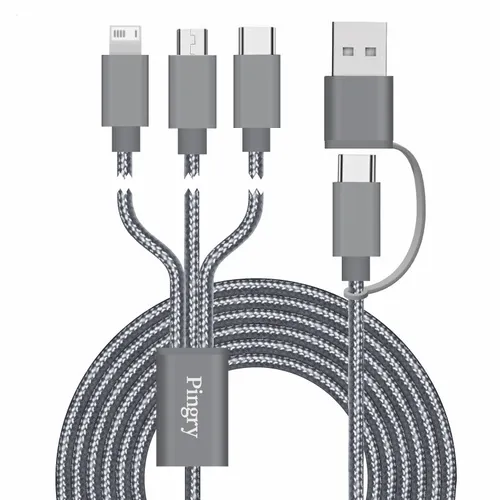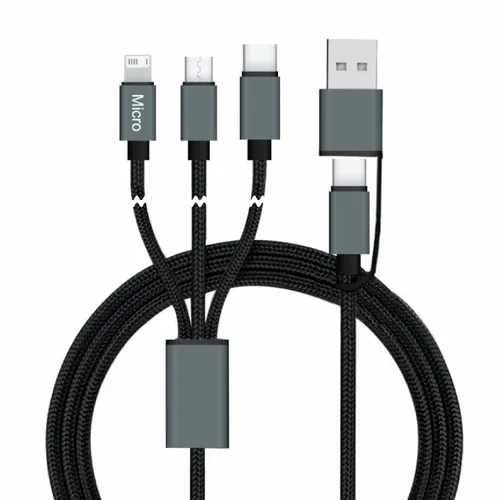 This sleek braided 3-in-1 charging cable covers all Smart Phones on the market. Featuring a Type-C input and MicroUSB, Type-C USB, and 8-pin style output connectors! Connect Reach supports simultaneous charging for 3 devices, all combined in one power cord. This extra-long, durable, and stylish cable will charge all your devices while you are on the go or at home.