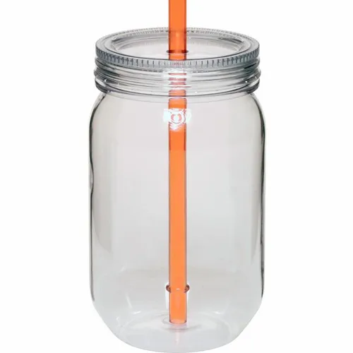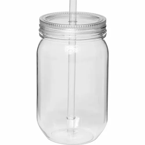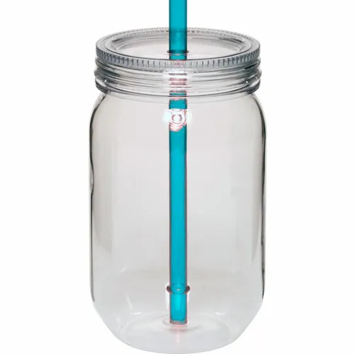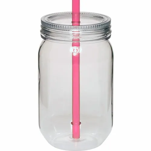 24 oz. Single Wall Plastic Mason Jars. AS Plastic Material. With Screw-on Lid and Straw. Hand Wash Only. Note: Do not microwave