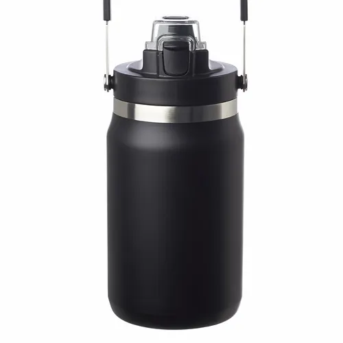 64 oz. Capacity. Screw On Tritan Lid with Press In Button to Open and Close. Tritan Flip Lid Lock to Cover Drinking Hole. Carrying Handle. Double Wall Stainless Steel to Hold Temperature. Great for Long Hikes and Long Travel