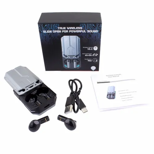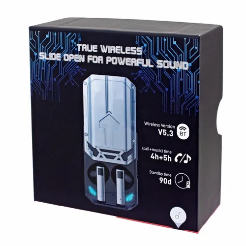 Ultra-low latency gaming true wireless stereo(TWS) earbuds. Features two built-in ultra-clear mics in each earbud to capture vocal sounds accurately. Allowing for clear communication during important business calls and online video meetings. Play music up to 5 hours on a single charge. The charging case sustains up to 22-28 hours of battery life. Specifications: wireless Version: 5.3 Power lnput: DC 5V Battery Capacity: 3.7V/30 mAh Charging Box Capacity: 3.7V/500