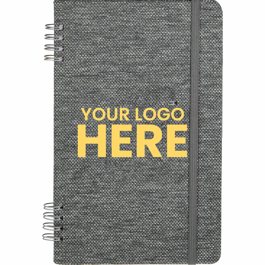 The 5 x 7 Vila Recycled Spiral Notebook is part of the sustainable, budget-friendly Vila collection, featuring a 100% rPET hard cover with spiral binding. Includes an elastic closure and 50 sheets of recycled lined paper. By choosing this notebook, youre making a positive impact on the environment, as one percent of sales are donated to environmental nonprofits through a partnership with 1% For The Planet.