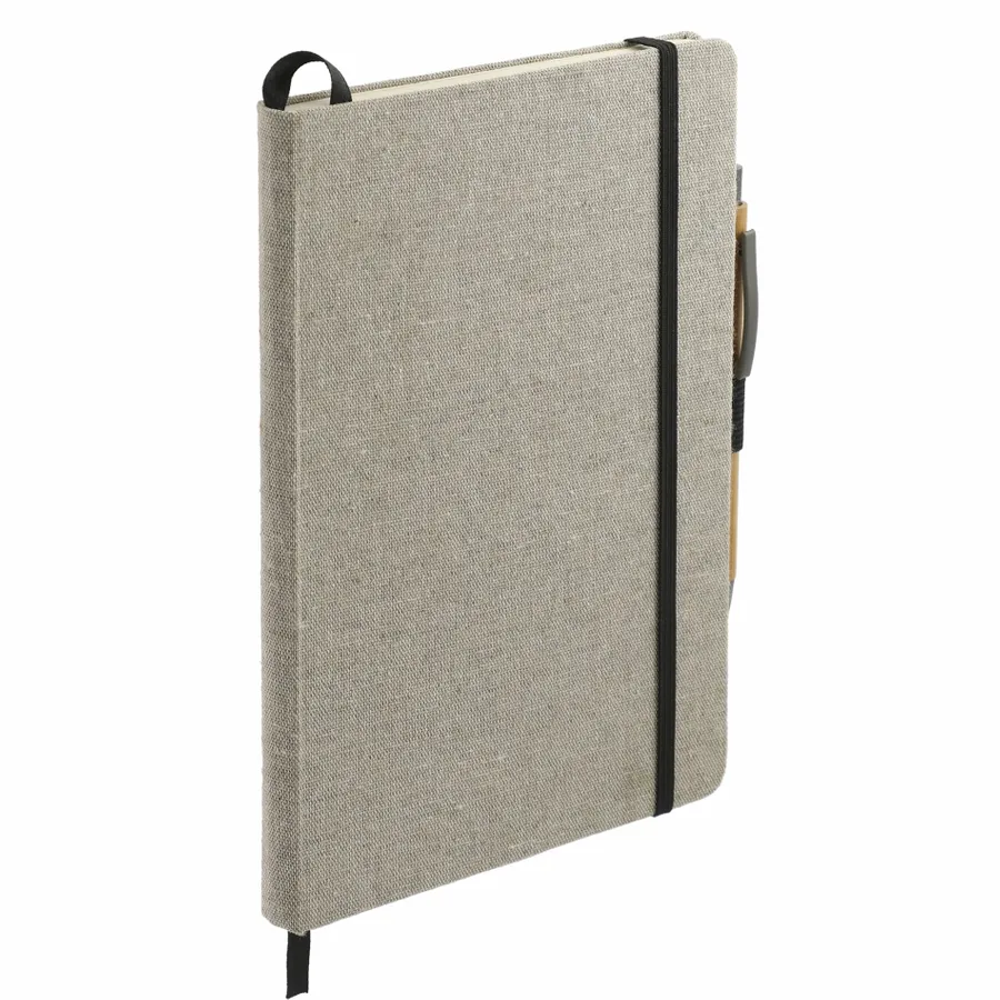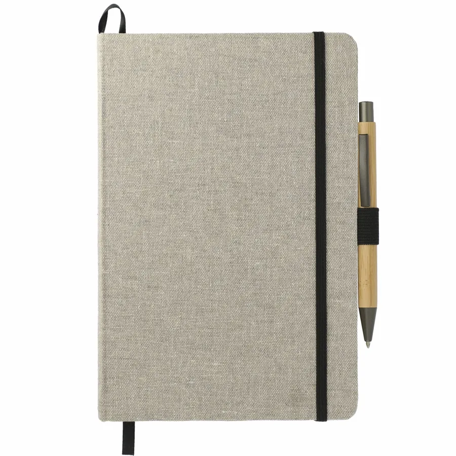 The 5.5 x 8.5 Recycled Cotton Bound Journal Set includes (2800-94) 5.5 x 8.5 Recycled Cotton Bound Journal and (1066-49) Bamboo Quick-Dry Gel Ballpoint. The 5.5 x 8.5 Recycled Cotton Bound Journal is the perfect journal for all of your notetaking needs. Features a recycled cotton, hard cover. Natural color elastic closure, pen loop and ribbon page marker. 80 sheets of FSC Mix cream lined paper. Back document pocket. FSC label printed inside. Through a partnership with 1% For The Planet, one percent of sales of this and all EcoSmart products are donated to environmental nonprofits.