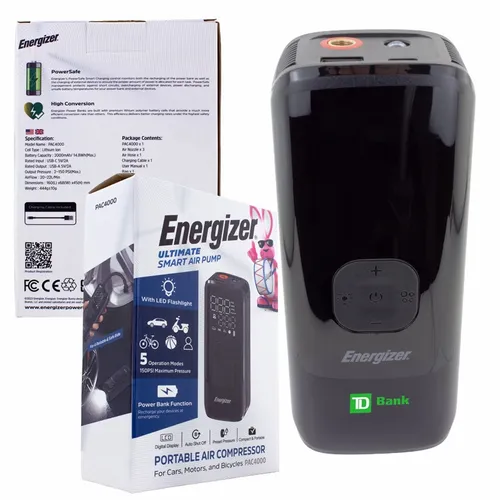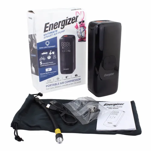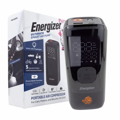 A portable and rechargeable electric tire pump with a large easy to view LED display. It has five inflation modes: automotive, motorcycle, and bicycle tires as well as a setting for sports balls. It also functions as a power bank with a USB output port located on top. Recharge the air pump's built-in lithium battery via its Type-C input port. It is packaged with a compact attachable air hose and a Type-C cable. AC wall adapter not included.