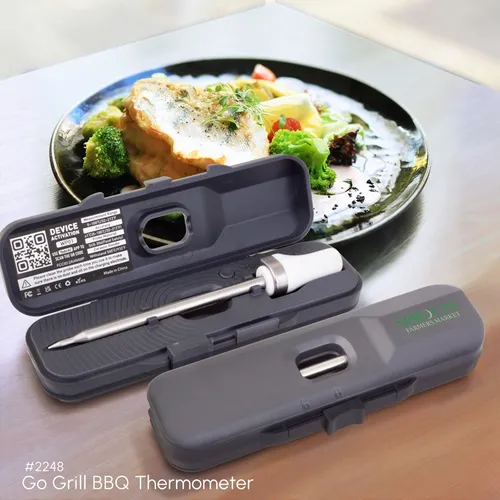 It's a smart BBQ thermometer probe that sends cooking temperature readings to the ToGrill phone app. The perfect tech promo for a wide range of industries related to food or activities such as picnics, camping, and sports.