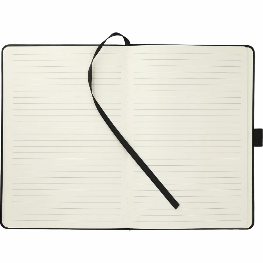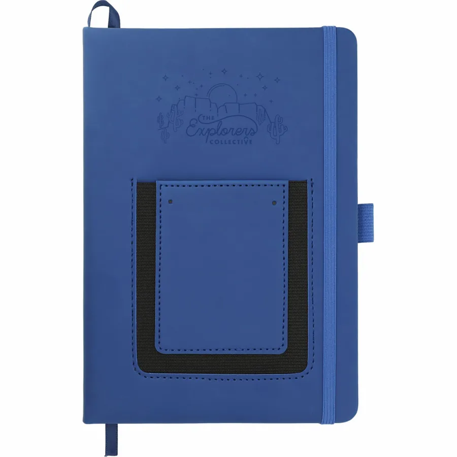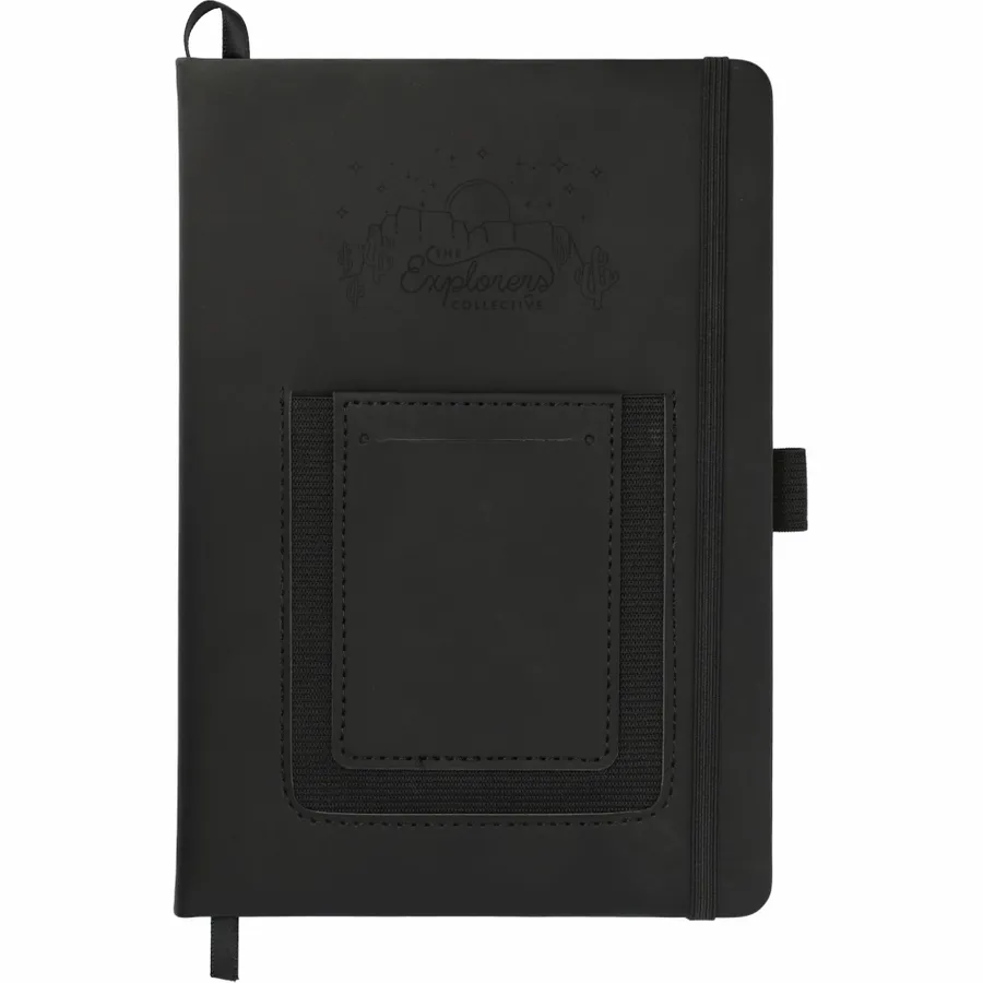 The 5.5 x 8.5 FSC Mix Vienna Phone Pocket Bound Journal features a smooth PU, hard cover and a front phone pocket with business card slot. Includes a color matching elastic closure, ribbon page marker and 80 sheets of FSC Mix cream lined paper.