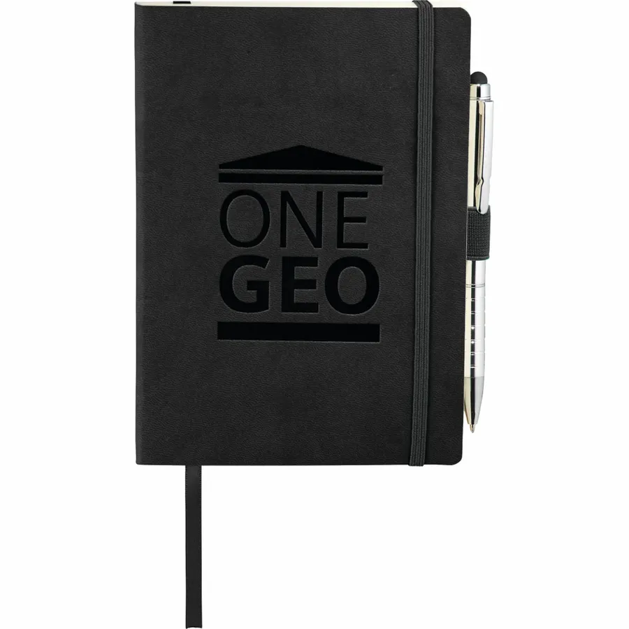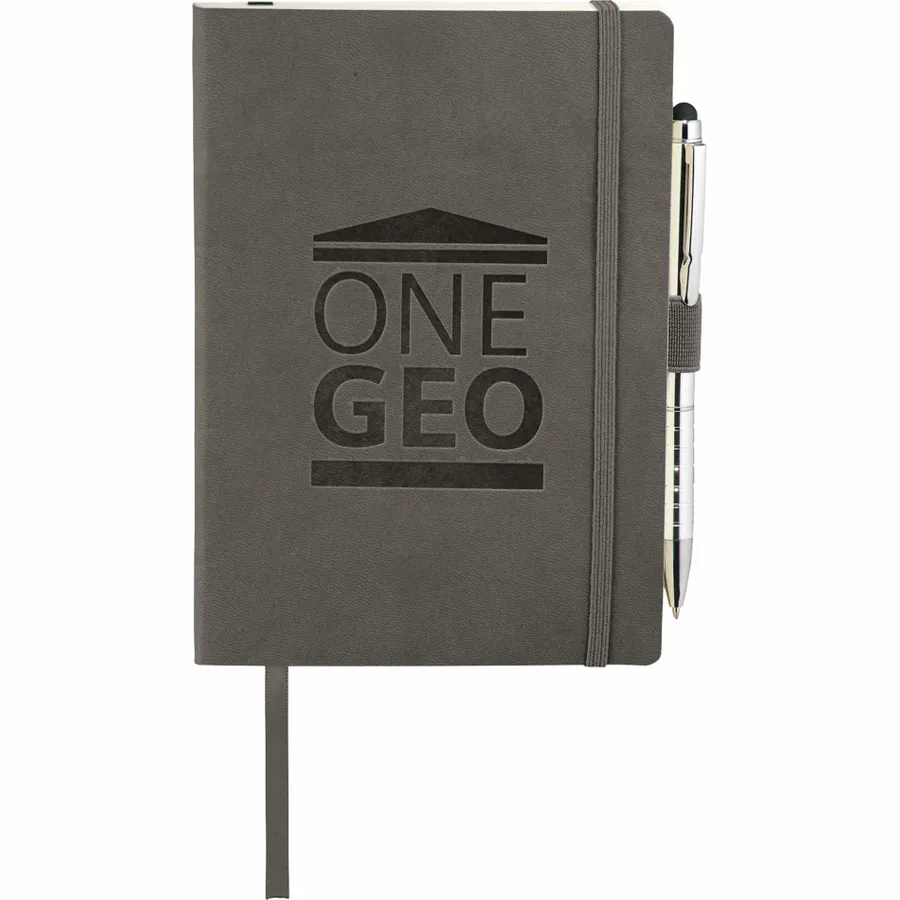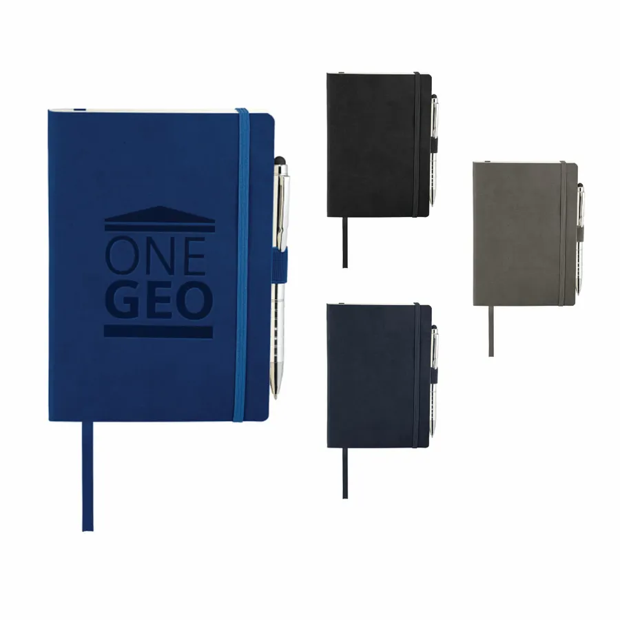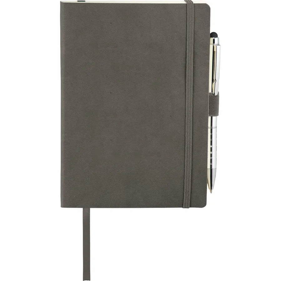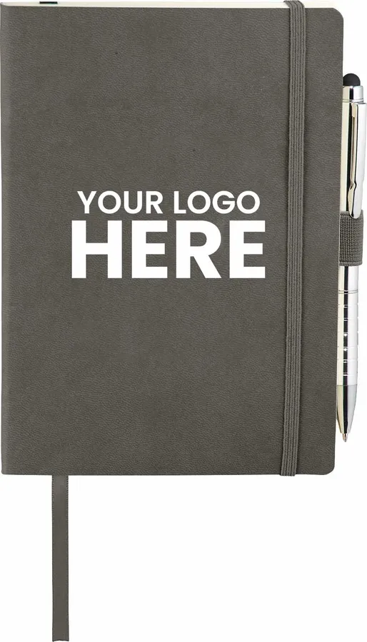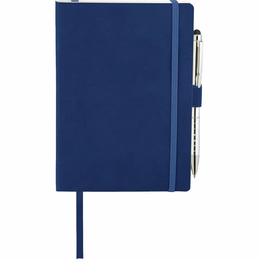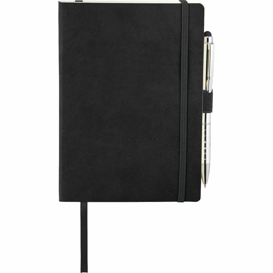 The Revello Soft Bound Journal Bundle Set includes one 5 x 7 Revello Soft Bound Journal (2700-67) and one Preston Dual Ballpoint Stylus (1065-08), bringing two classic essentials together. The included UltraHyde notebook has a document pocket on its interior back cover, contains 80 sheets of cream lined paper, and shuts with a built-in elastic closure. The journal also contains an integrated pen loop and ribbon page marker. The included stylus is eligible for free laser set-up.
