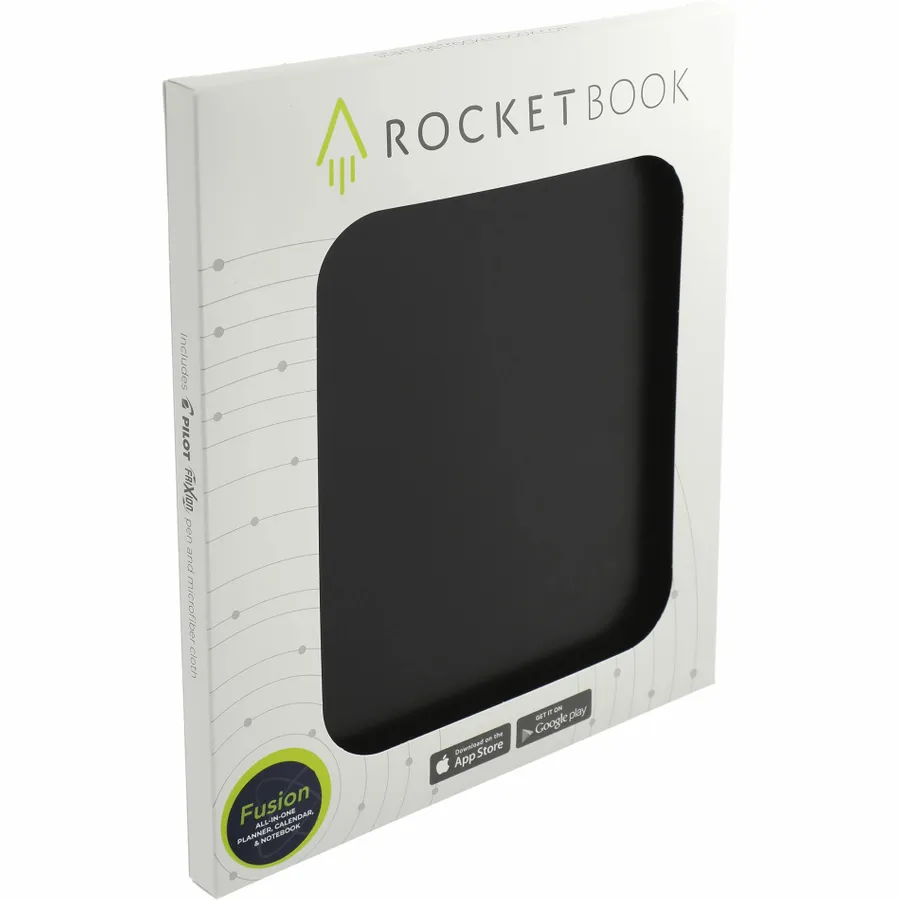 The Rocketbook Fusion is designed for every classroom, office, and personal mission. The Fusion is a reusable pen and paper notebook with seven different page templates that connect to your favorite cloud services. 42 futuristic pages are packed with calendars, to-do lists, and notetaking layouts. And of course the Fusion is made with patented reusable Core technology. The synthetic paper allows you to write smoothly with a Pilot FriXion pen, then magically wipe clean with a damp cloth to reuse again and again! Use the Rocketbook app to blast your notes, plans, lists, and big ideas to the cloud for proper organization. Then, erase and reuse your Fusion for your next adventure! This set includes Rocketbook Fusion Notebook, Pilot Frixion Erasable Pen, microfiber wipeable cloth, instruction manual.