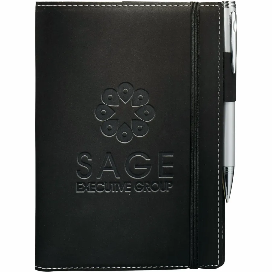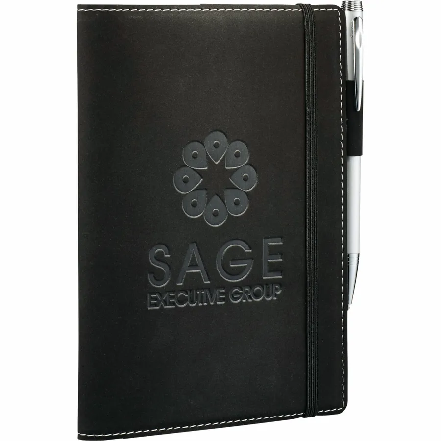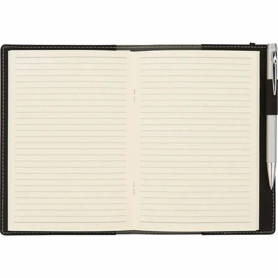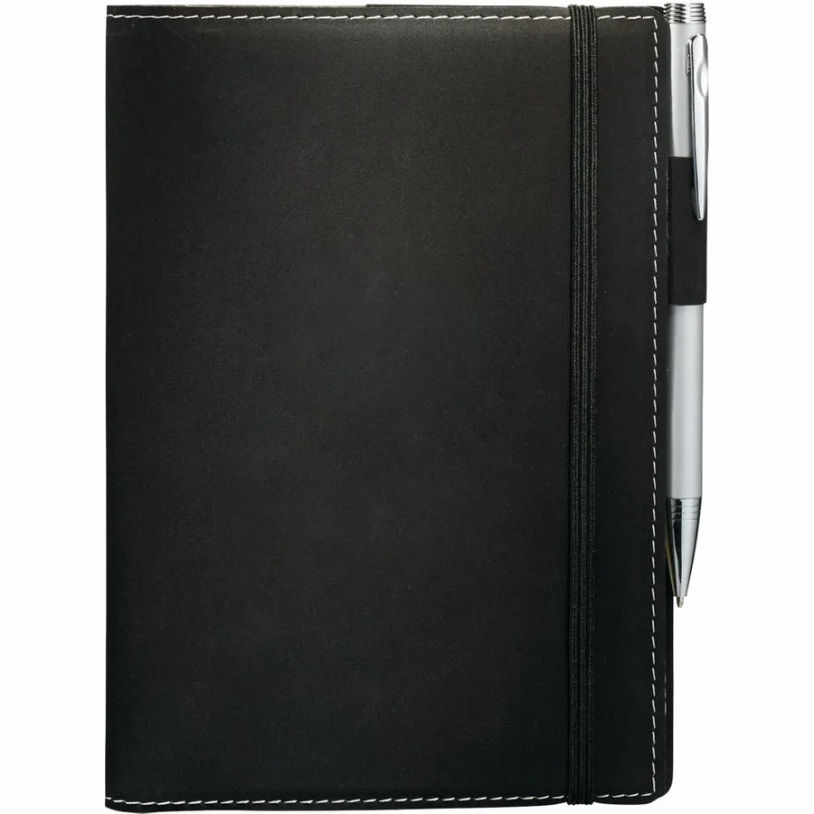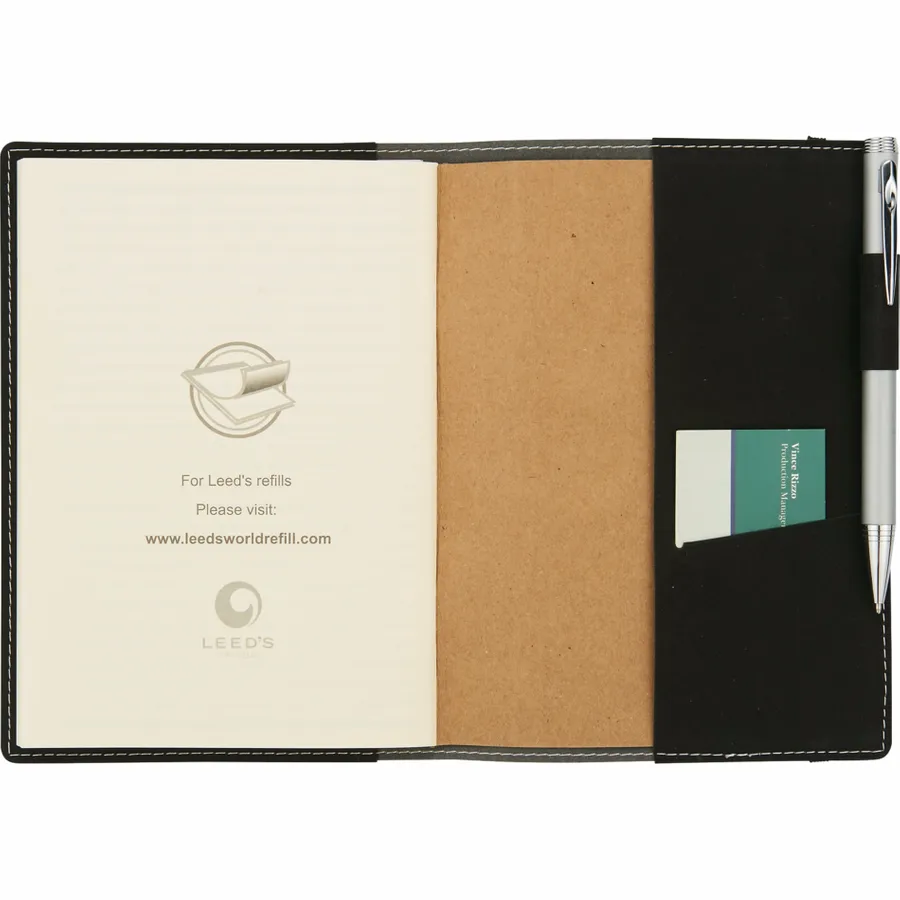 The 5.25 x 7.5 FSC Mix Revello Refillable Journal features a flexible soft cover and built-in elastic closure. This refillable Journal includes 60 sheets of cream lined FSC Mix paper, business card slot, and pen loop. Get 5 x 7 paper refills for this Revello Refillable Journal from leedsworldrefill, 9091-97RF. Pen not included.