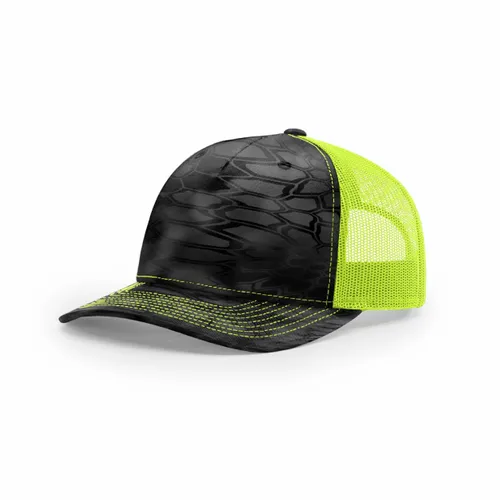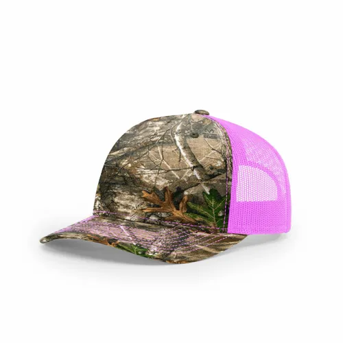 100% Polyester Green Camo/Digital Camo: Front: 97% Cotton/3% PU Spandex, Back: 100% Polyester Polyester Twill Fabric, Trucker Mesh Green Camo/Digital Camo: Cotton/Spandex Twill Fabric, Trucker Mesh Structured, Five-panel, Mid Pro Profile Pre-curved Bill, Solid Undervisor Adjustable Snapback Closure Women Fit: Kryptek Typhon/Neon Pink Realtree Edge/Neon Pink