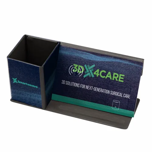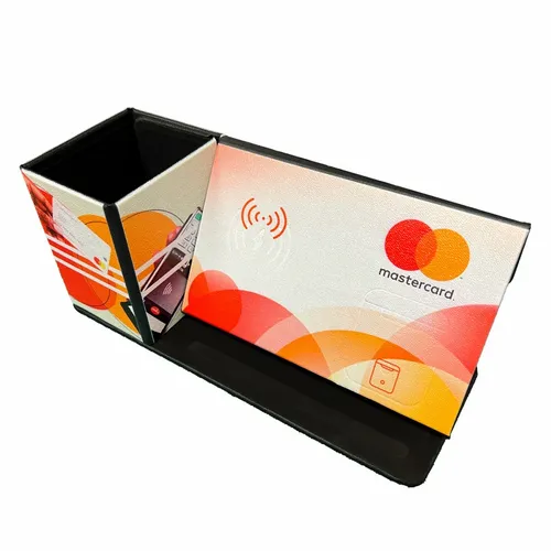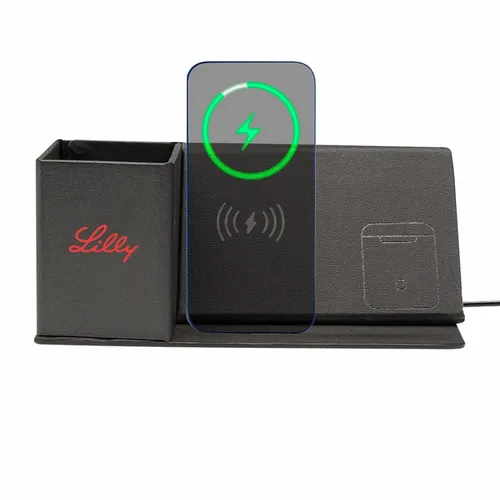 Coming end of April. The Chi-Charge Desktop Organizer offers ample branding space with full-color printing, making it perfect for showcasing your brand and communicating your message effectively. It features a fast 15W wireless charging spot for phones and a dedicated charging spot for AirPods. Plus, it’s designed for easy storage and shipping, as it can be shipped flat. It also has a Type-C input, pen holder, detachable dry-erase board, and marker.